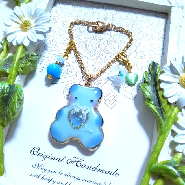 ハートベア ✦ スウィートブルー ✦ バッグチャーム 落ち着いたブルーカラーにキャンディのようなハートを閉じ込めました。 キャッツアイを使ったチャームで飾りました。 ※チャームは取り外し可能です。 背面は 表と同カラー ※手作業のため気泡、ムラ、小さい糸くずの混入等がある場合があります。 ※色はモニターや光の影響で写真と実物の見え方が若干異なる場合がございます。 ※ラッピング済み ※お届けは1枚め画像のお品になります。 ※撮影小物やペアご紹介の作品は含まれません。 ※指定ラッピング以外の変更はお受けしておりません。 ※作品は、個人使用を目的とした範囲でのみ購入が可能です。 第三者への転売を目的としたご購入はご遠慮ください。 ※ご不明な点がございましたら、購入前にお問い合わせより お問い合わせください。
