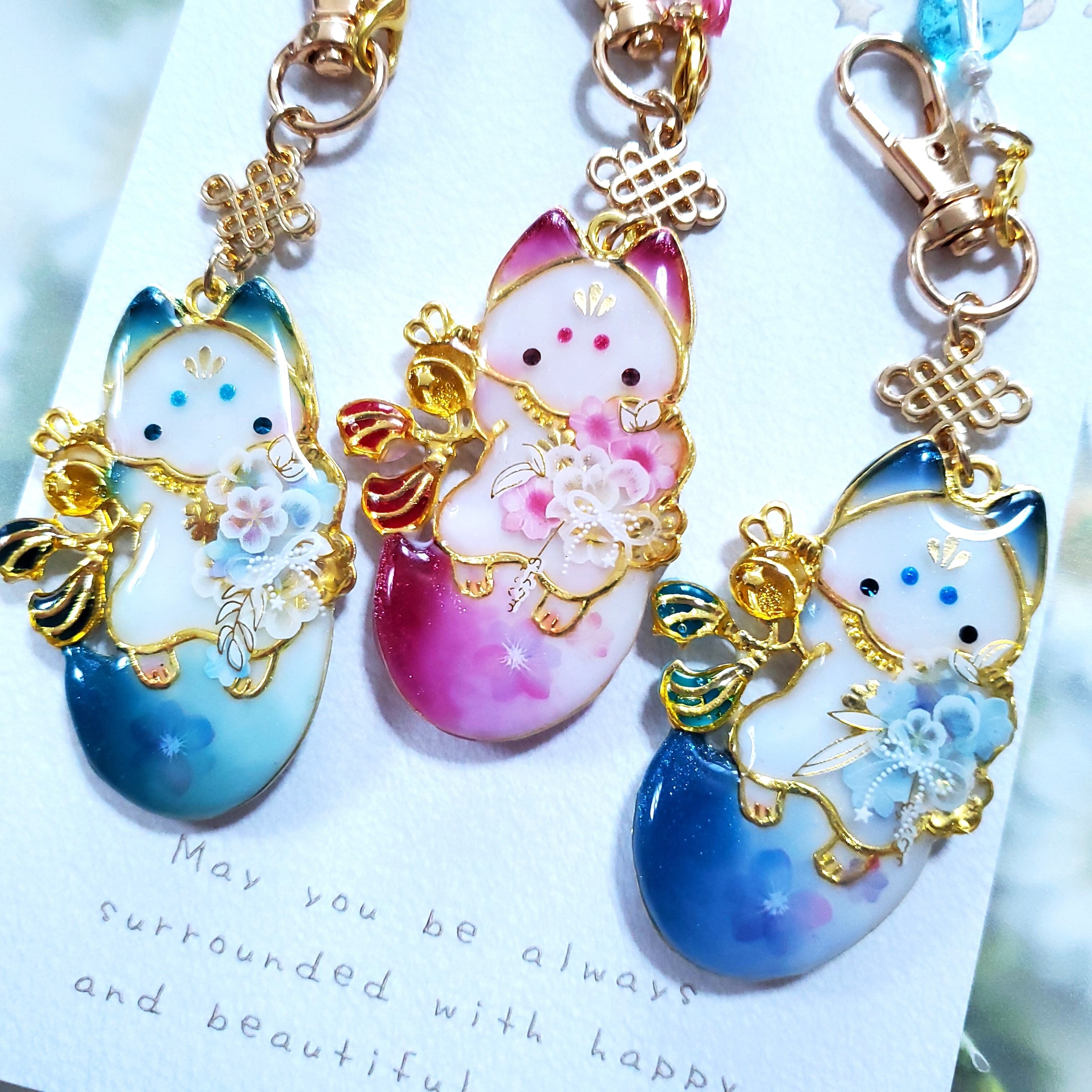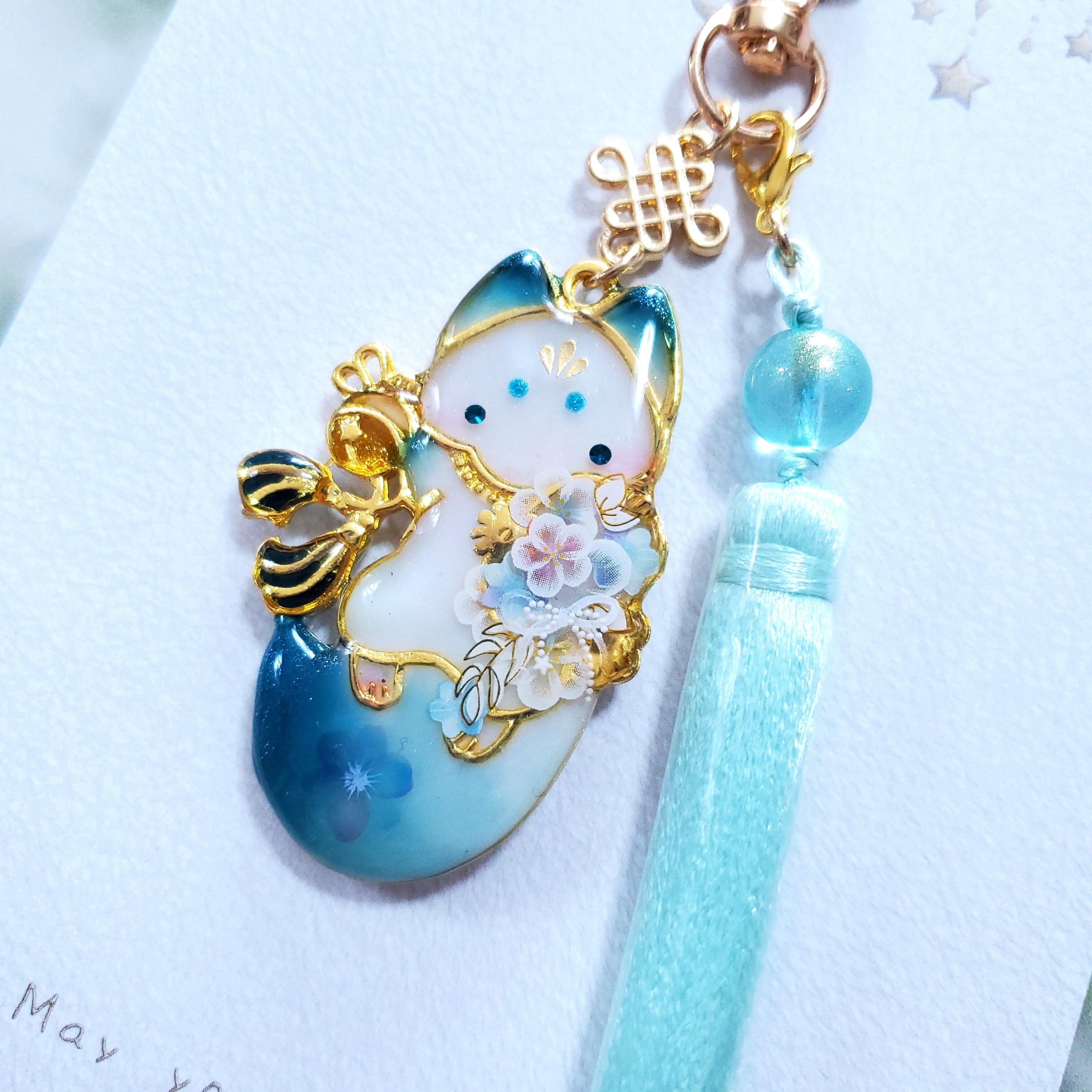 ふんわりしっぽの招き狛狐 ✦ 碧色 ✦ キーホルダー