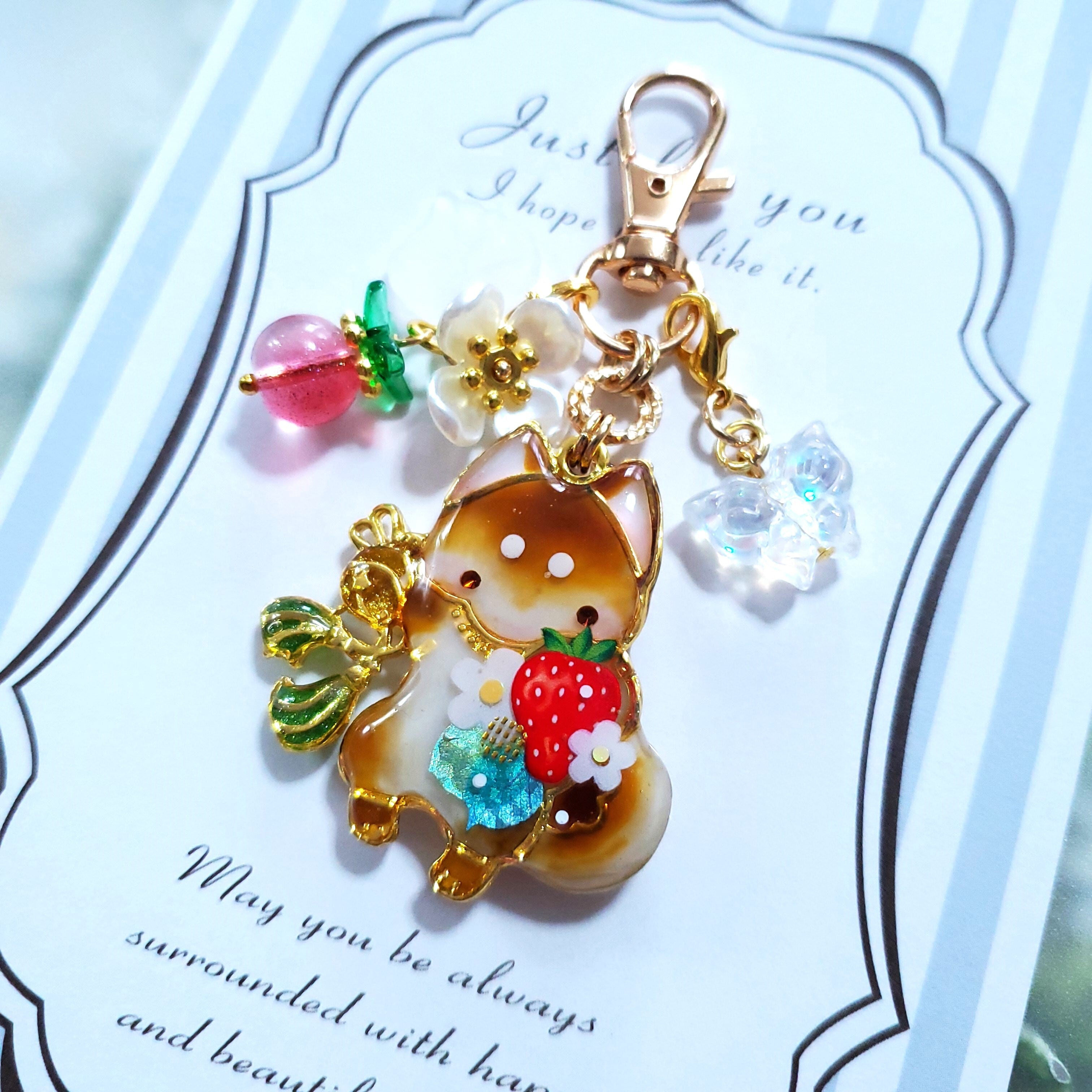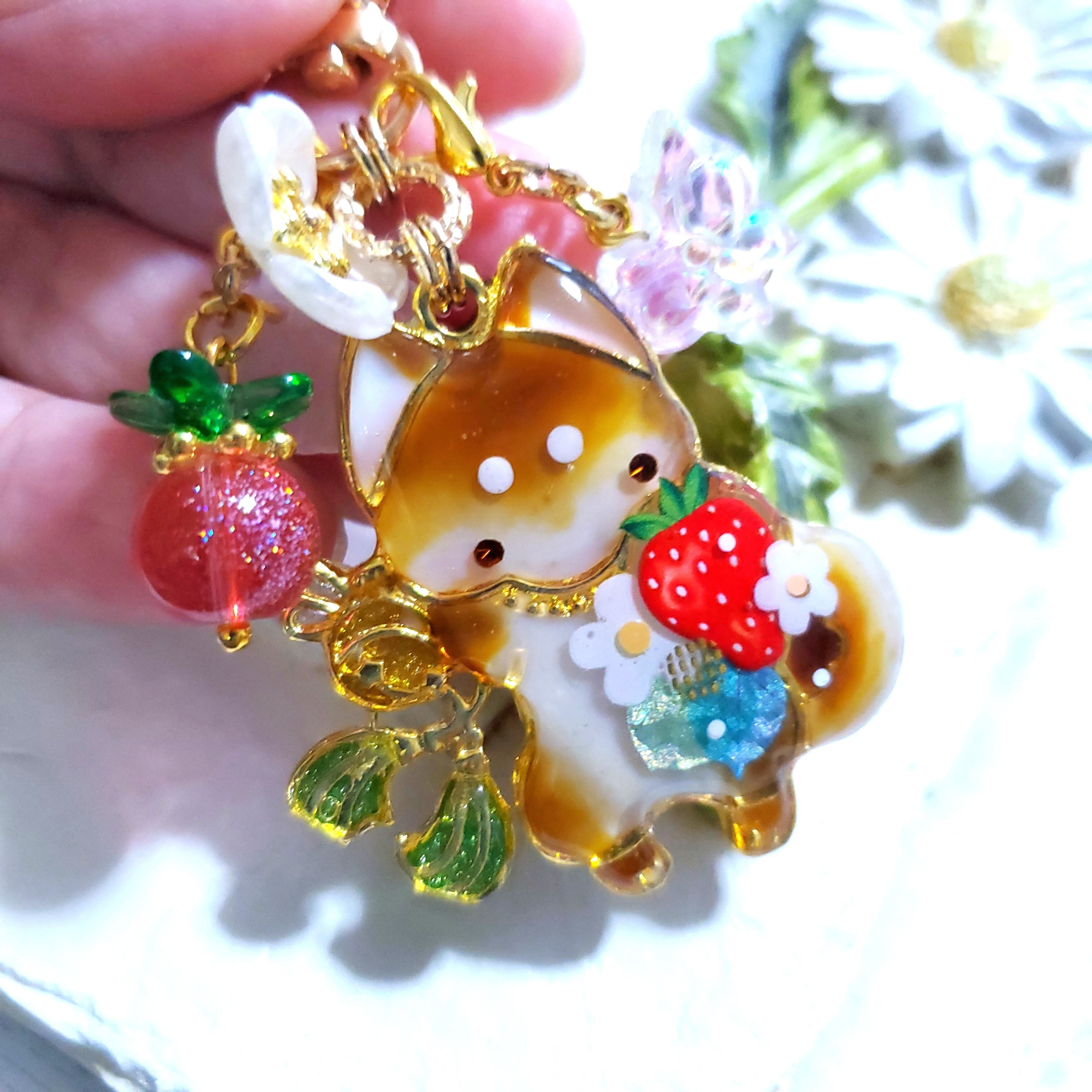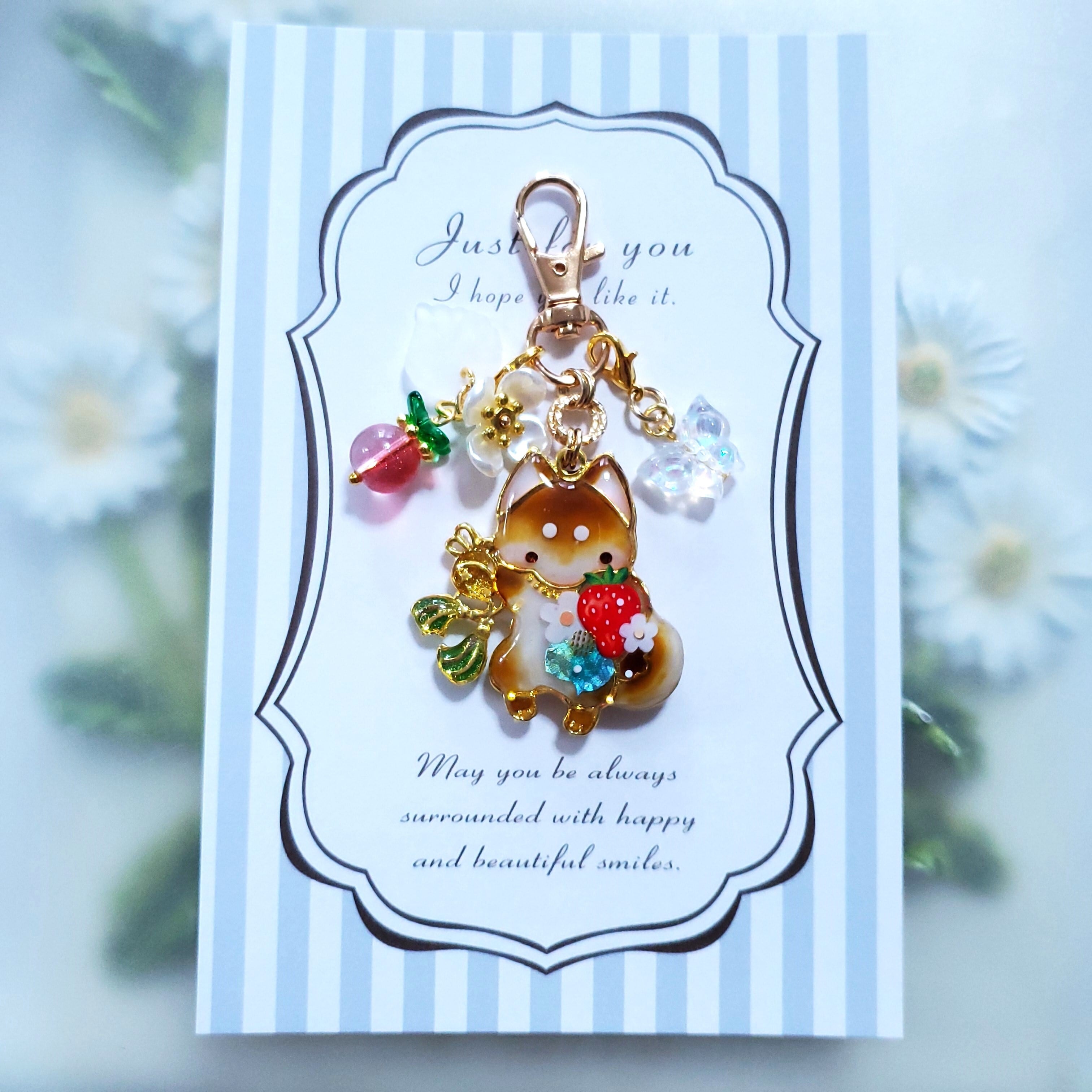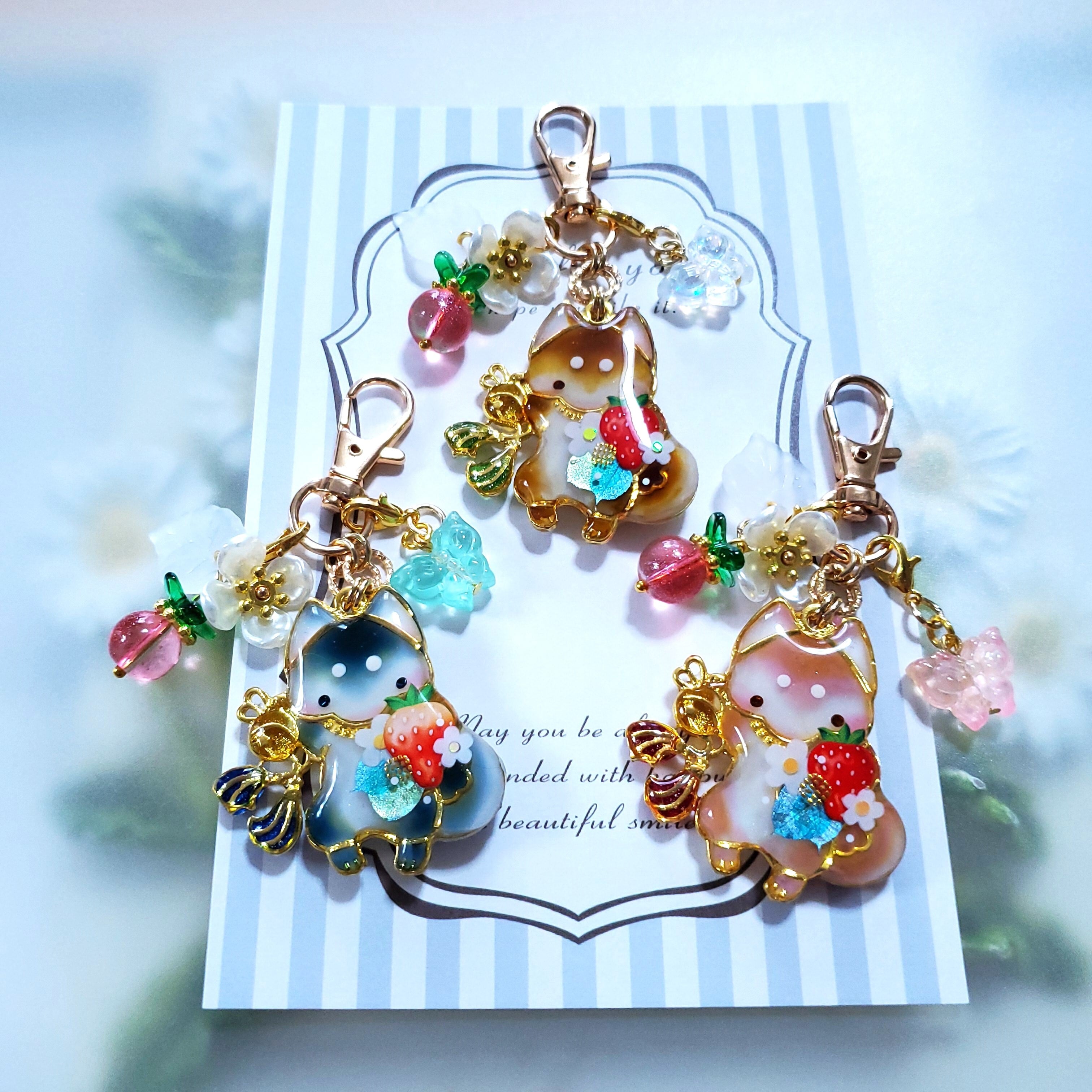 ガラスビーズのいちごや蝶のビーズチャーム付き。