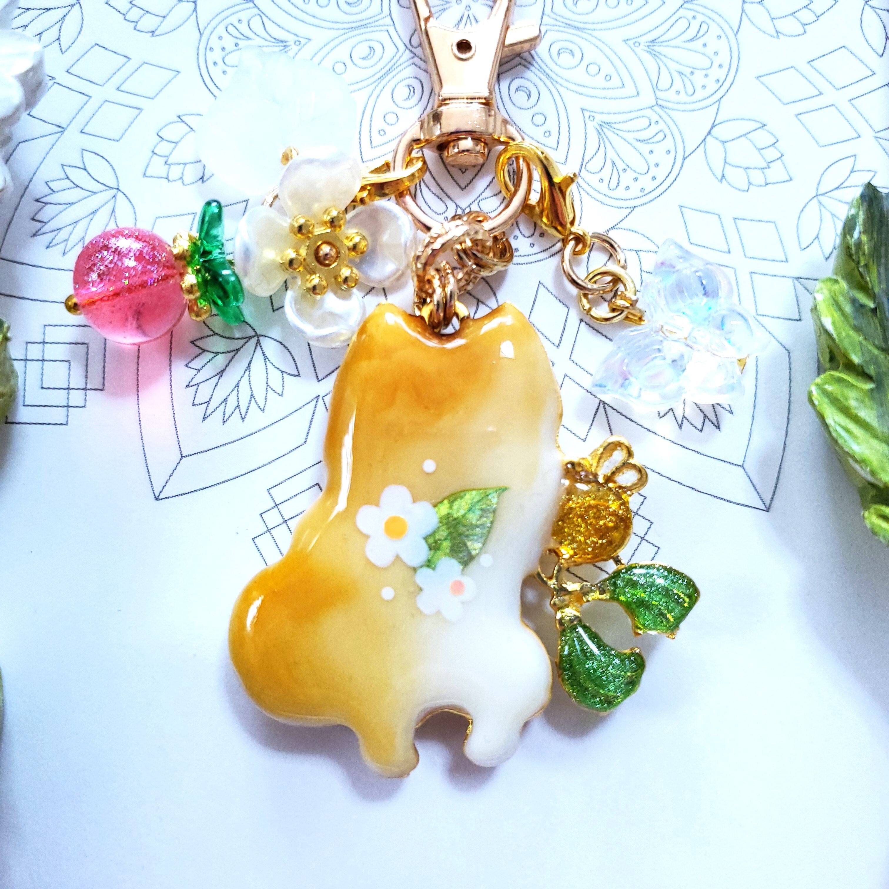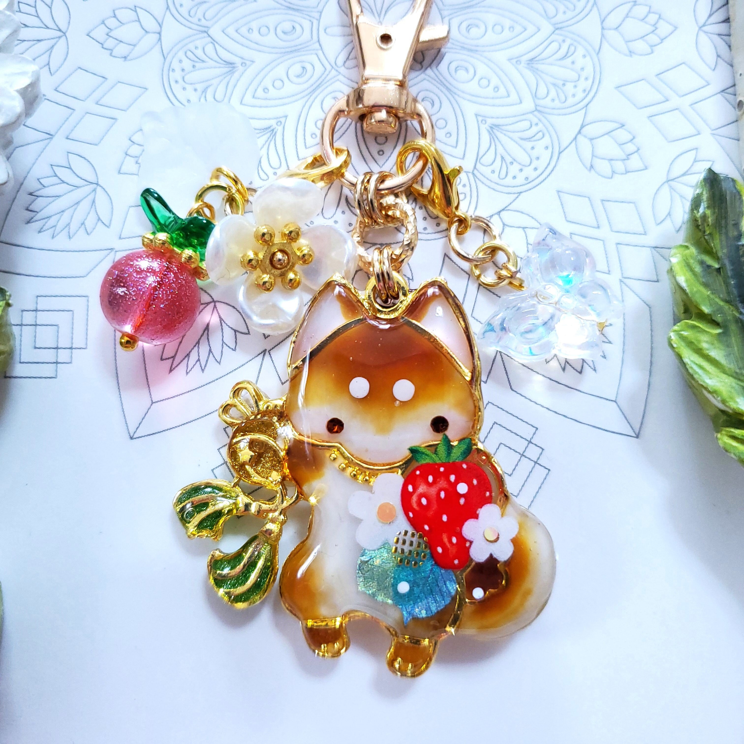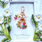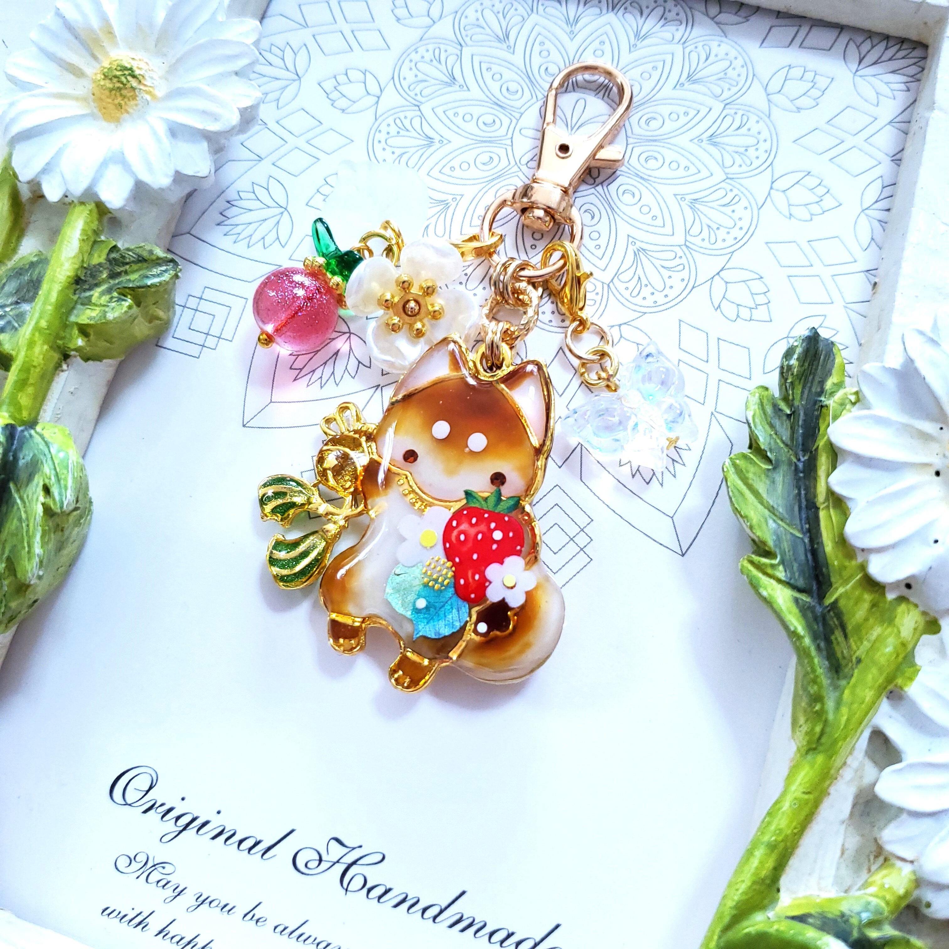 ガラスビーズのいちごや蝶のビーズチャーム付き。
