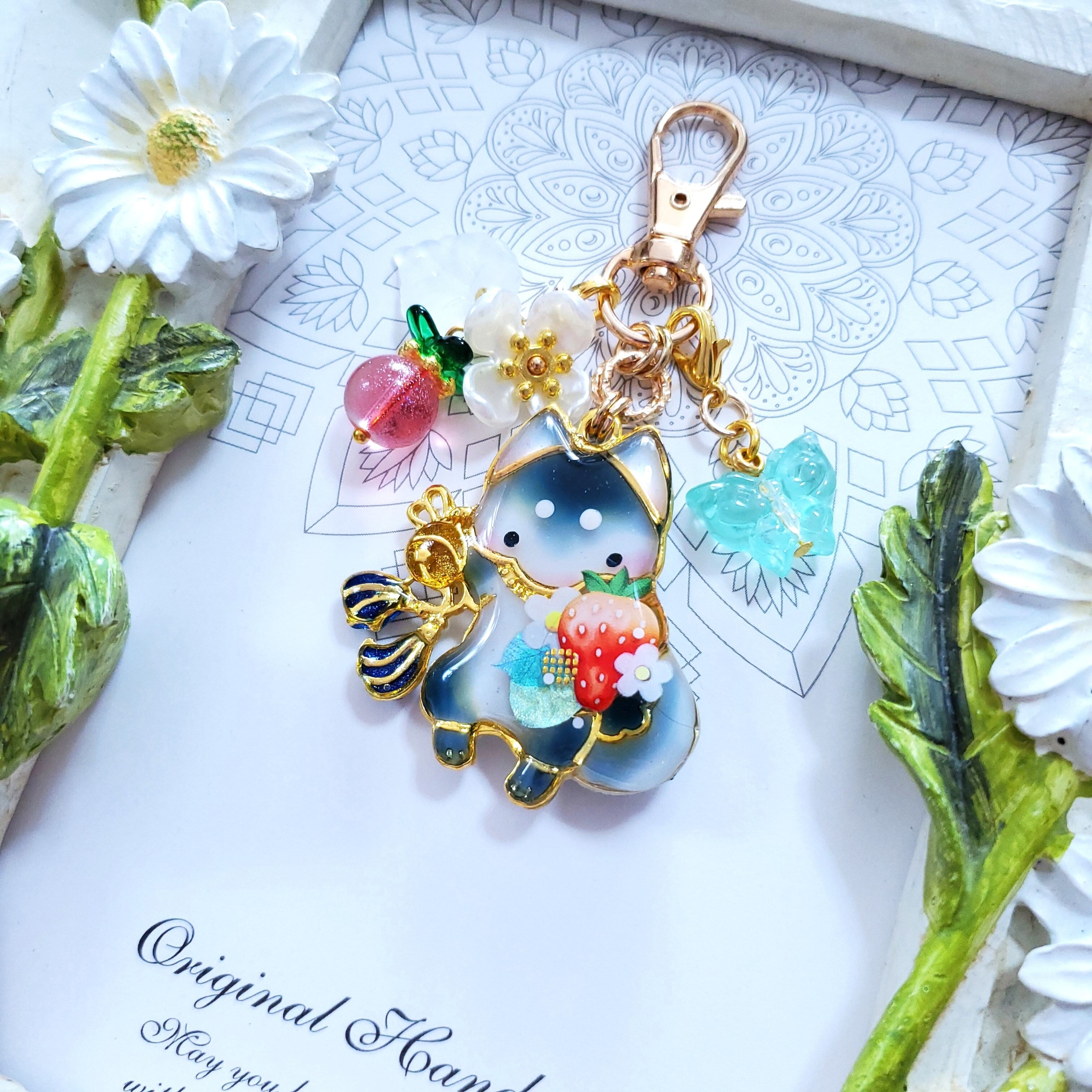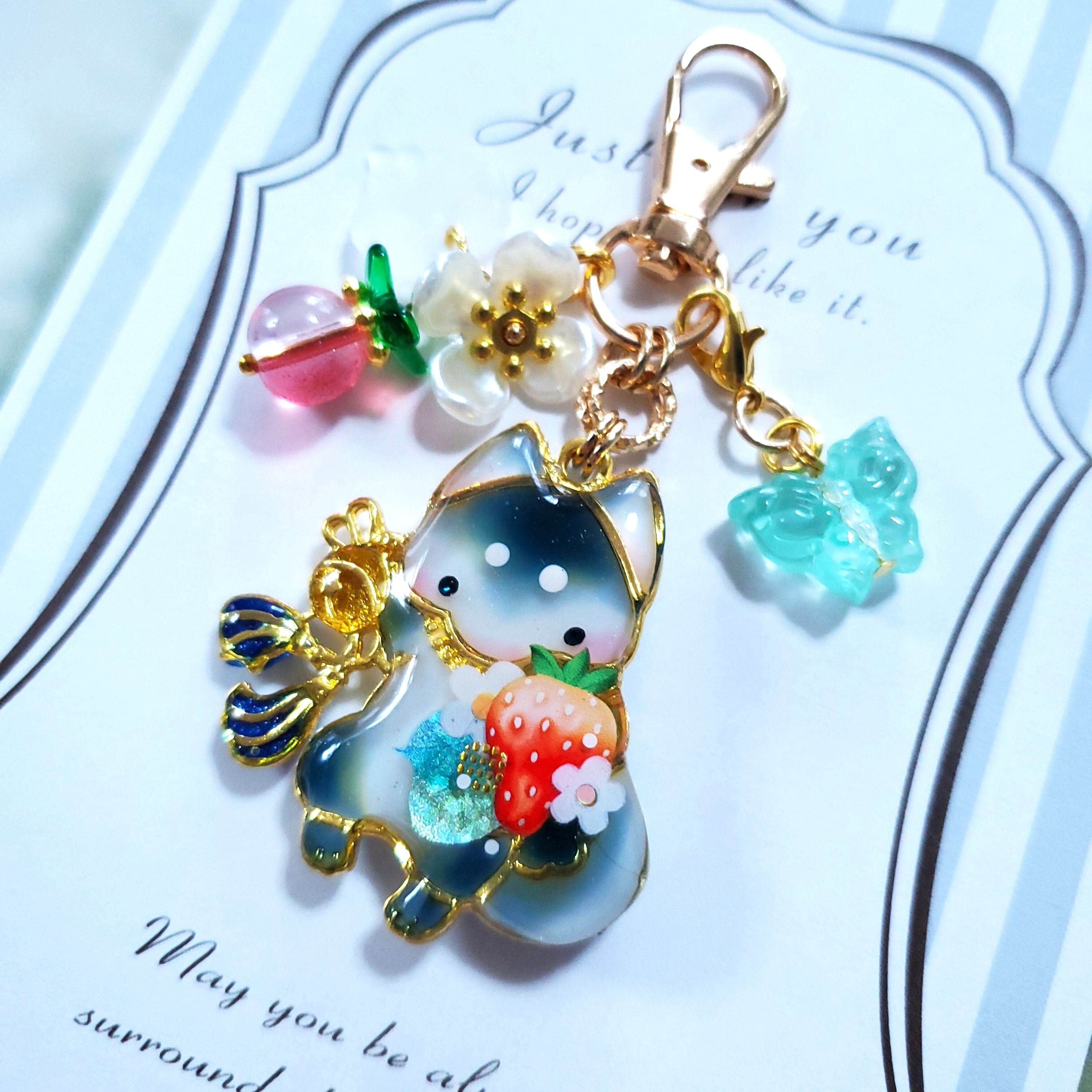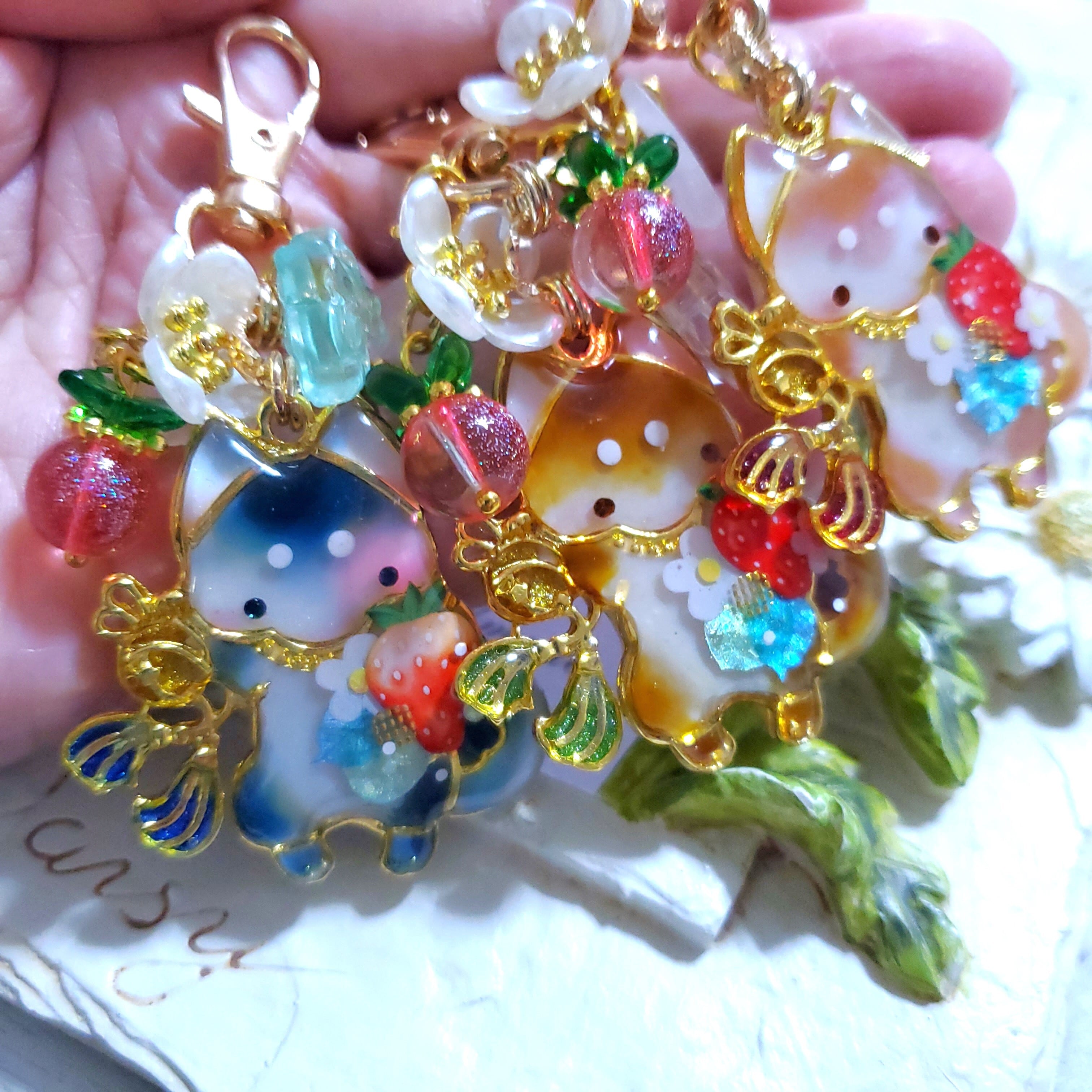 ガラスビーズのいちごや蝶のビーズチャーム付き。
