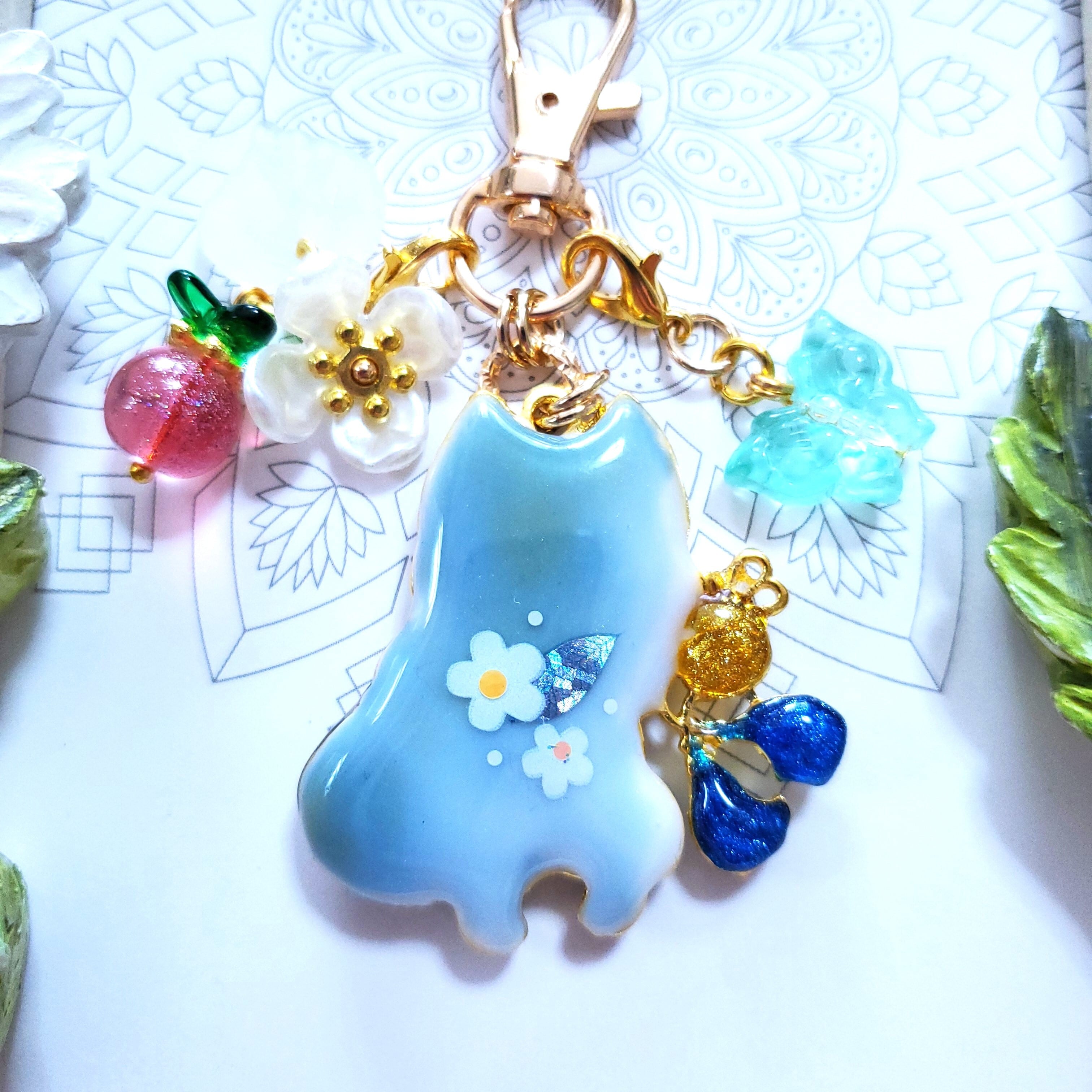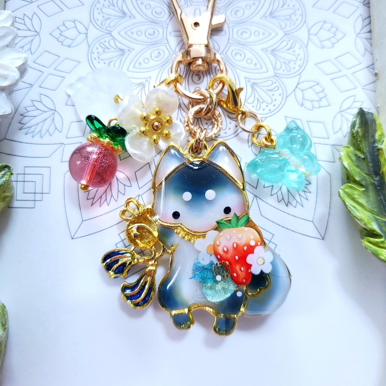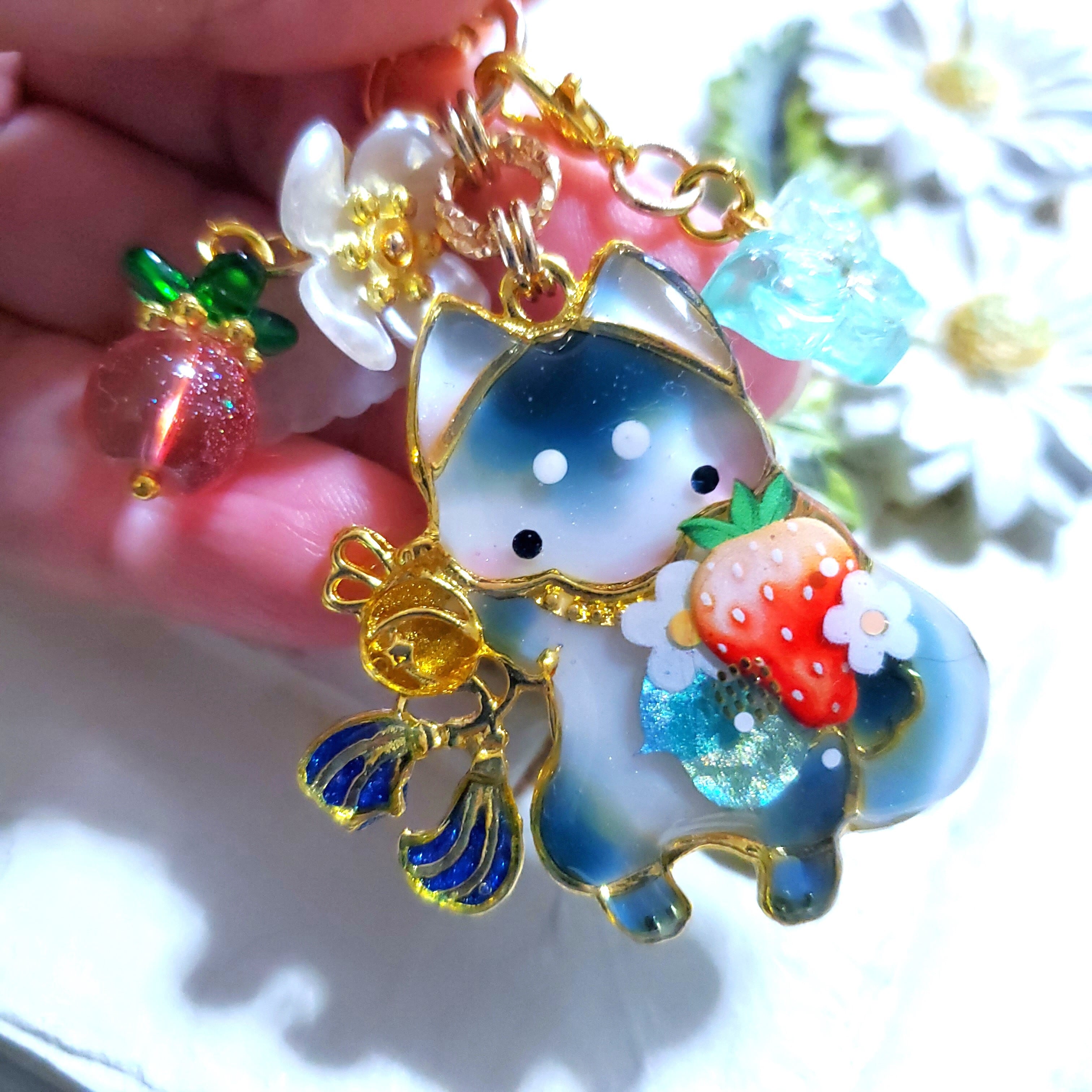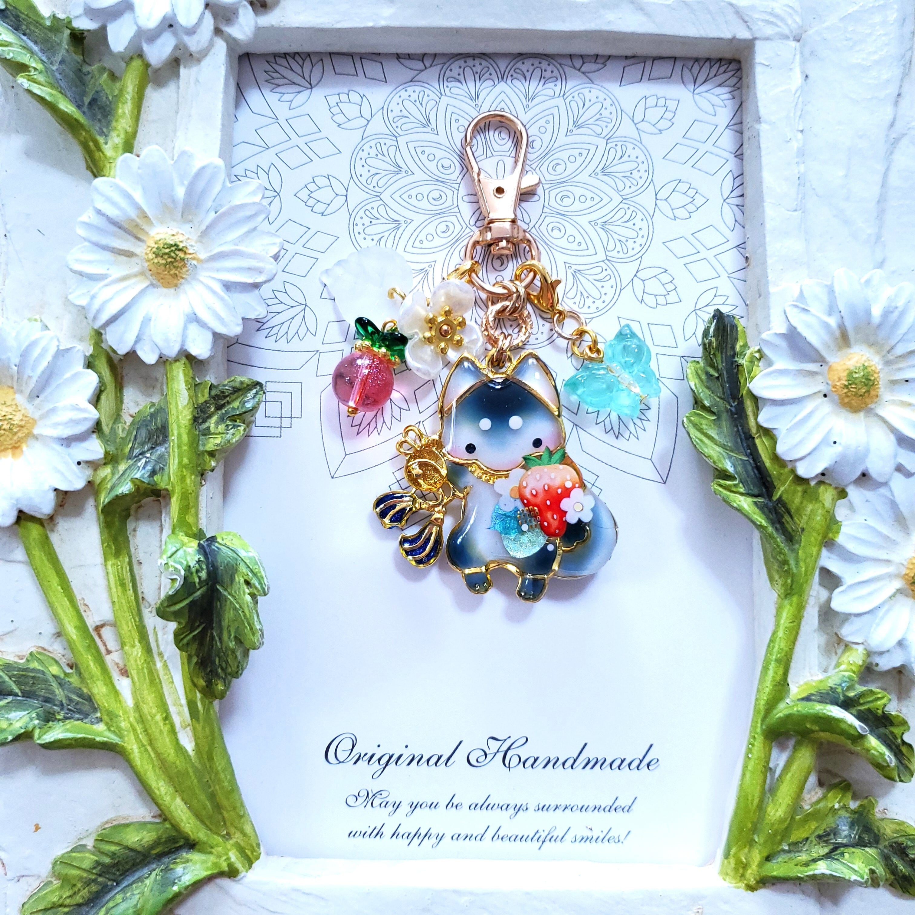 ガラスビーズのいちごや蝶のビーズチャーム付き。