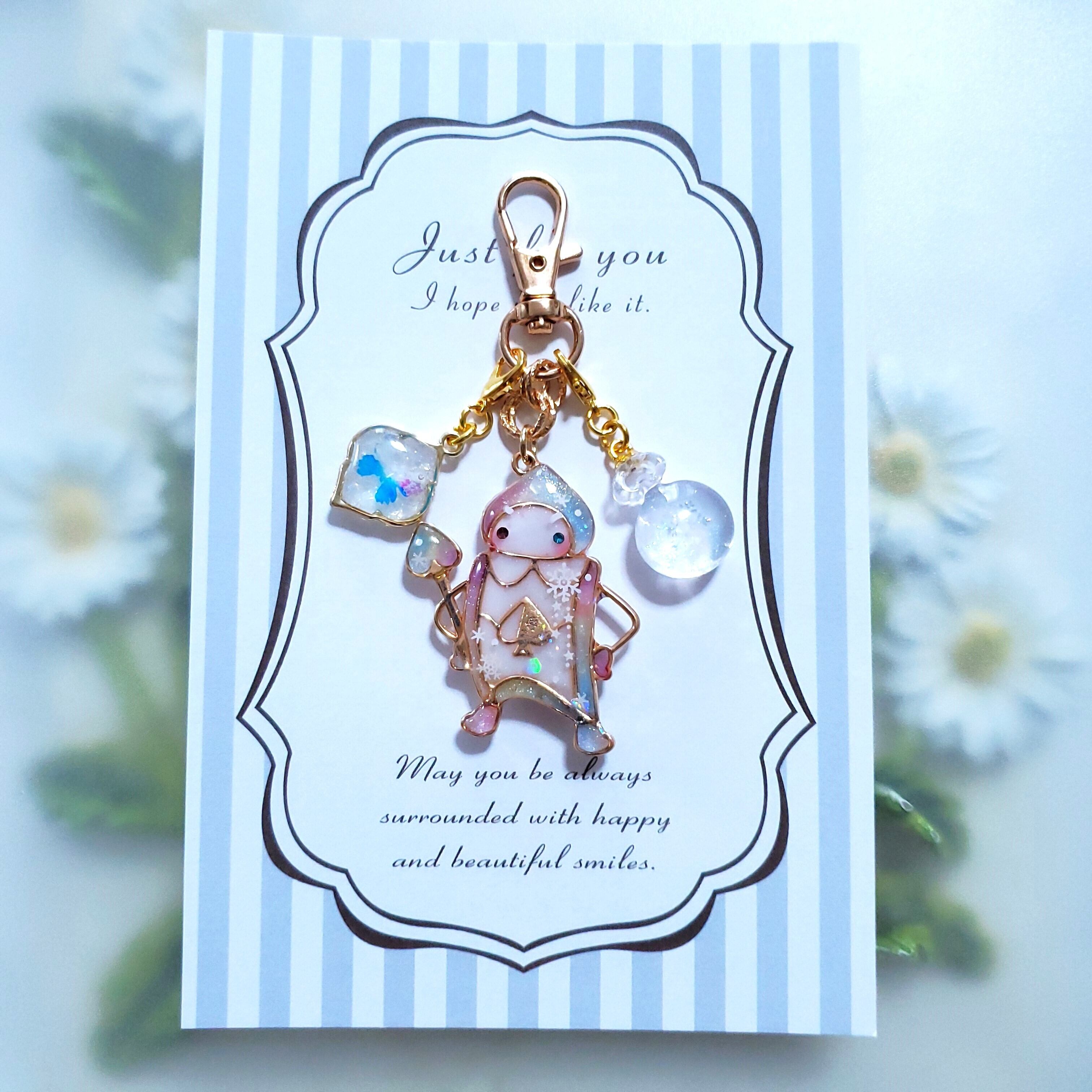 お揃いカラーの雪時計と蝶のチャーム付きです