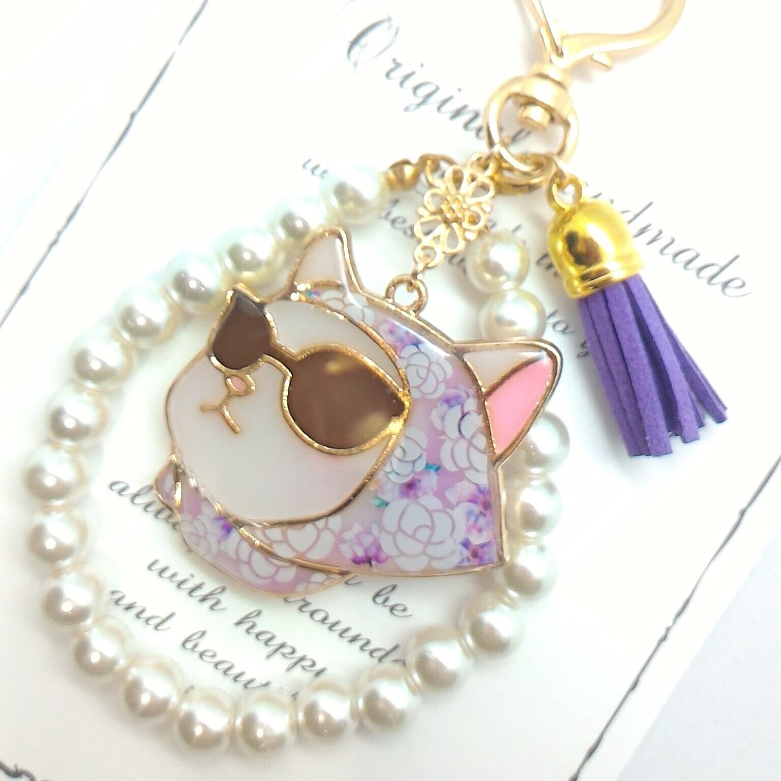 sold out ✦ おしゃれネコのキーホルダー ✦ 白猫&パール