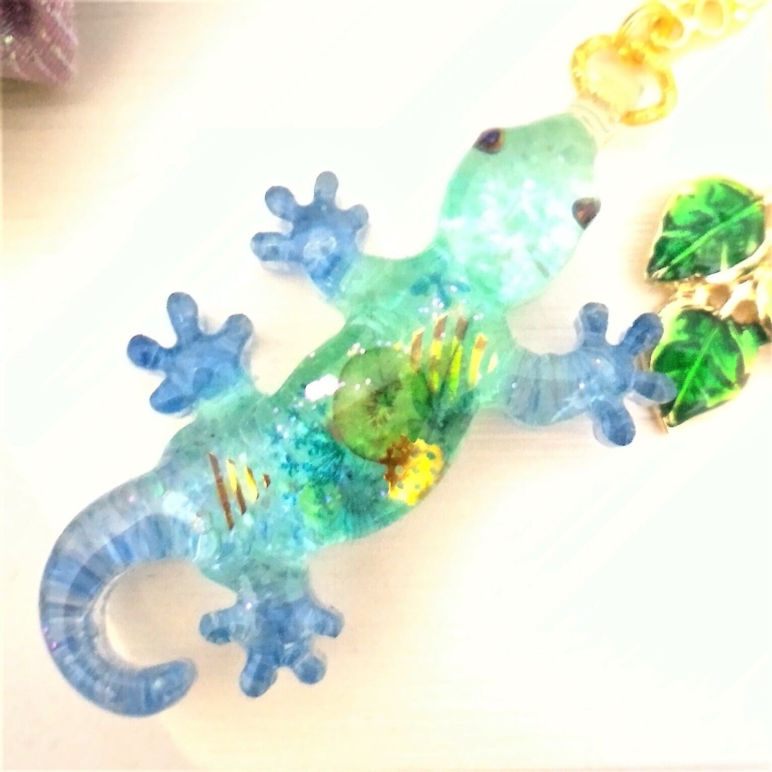 やもりに合わせて明るい色の葉っぱチャームをおつけしました。