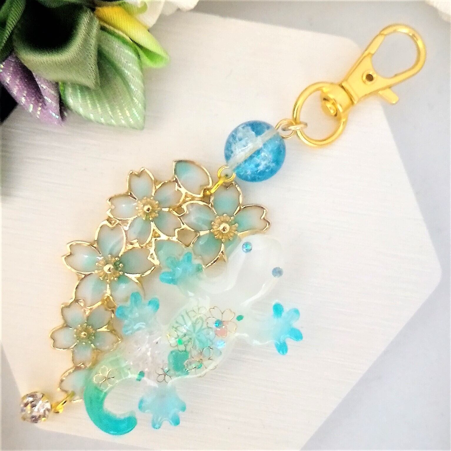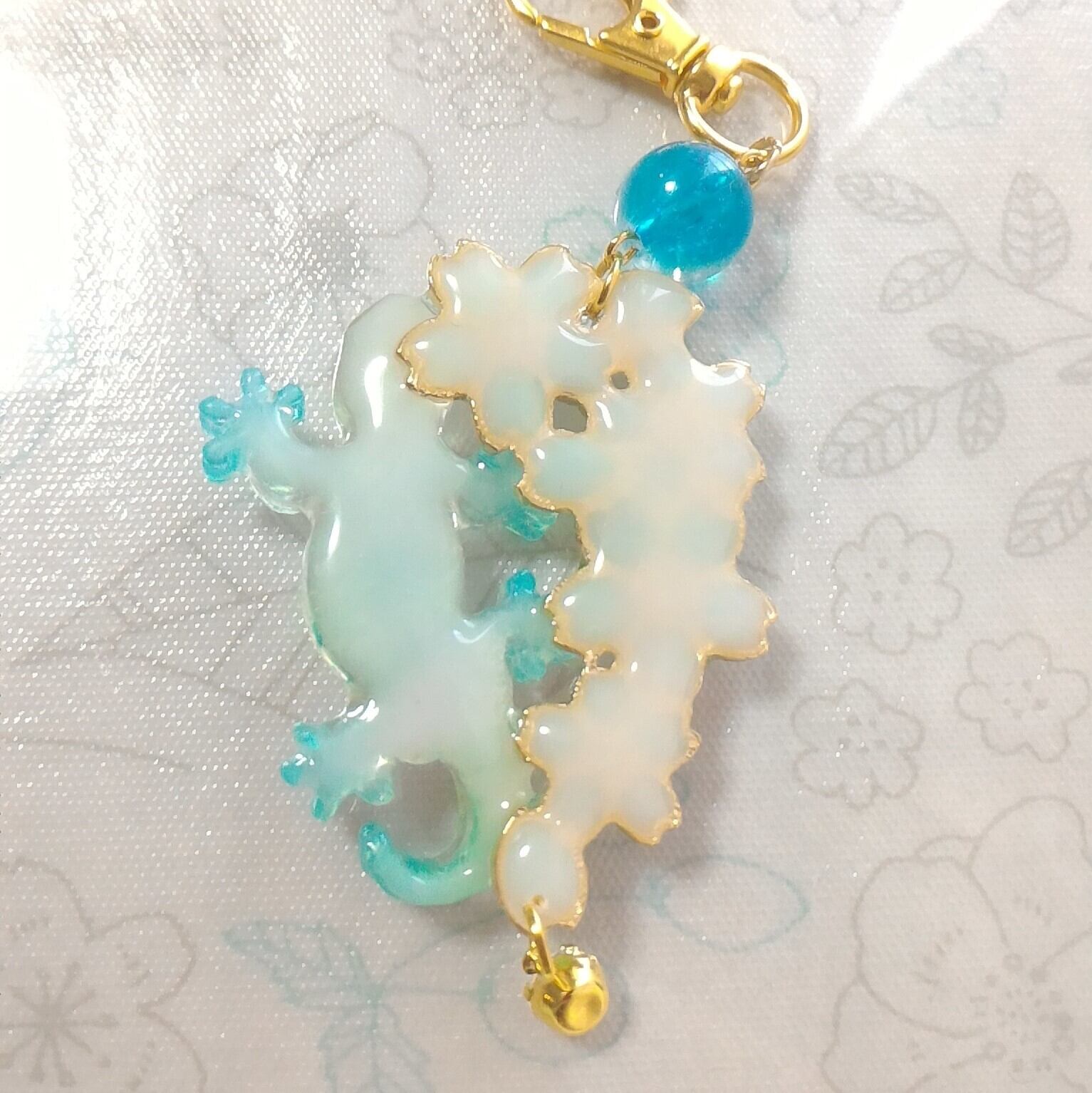 ラメでキラキラしたグリーンで仕上げた 桜とやもりです。 体に入った模様の参考画像になります♪ ボディはクリア仕上げで多層にお花を入れています。 背面は優しいミルキーホワイトホワイト仕上げです。