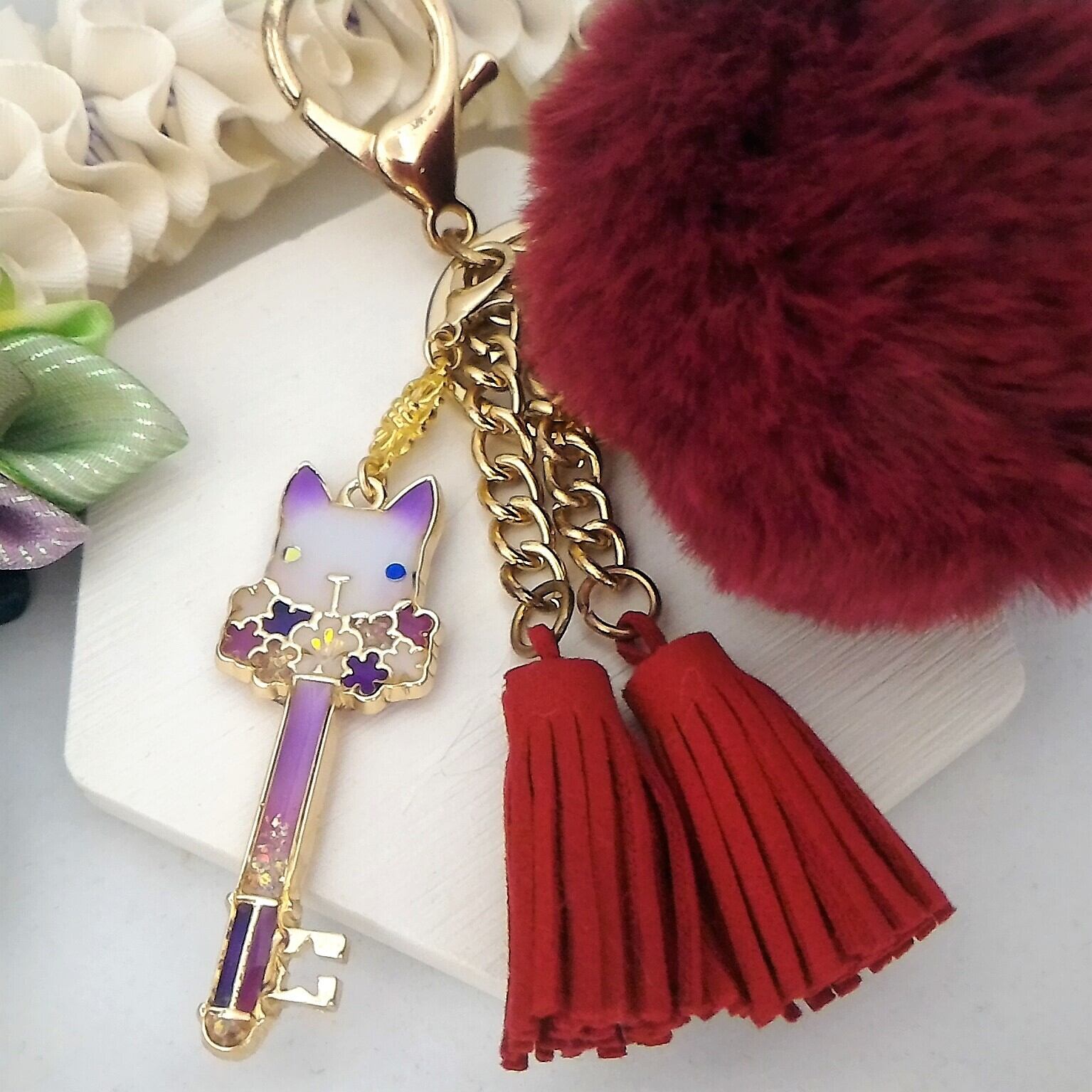 エンジ系のもふもふボール&タッセル付きキーホルダーに