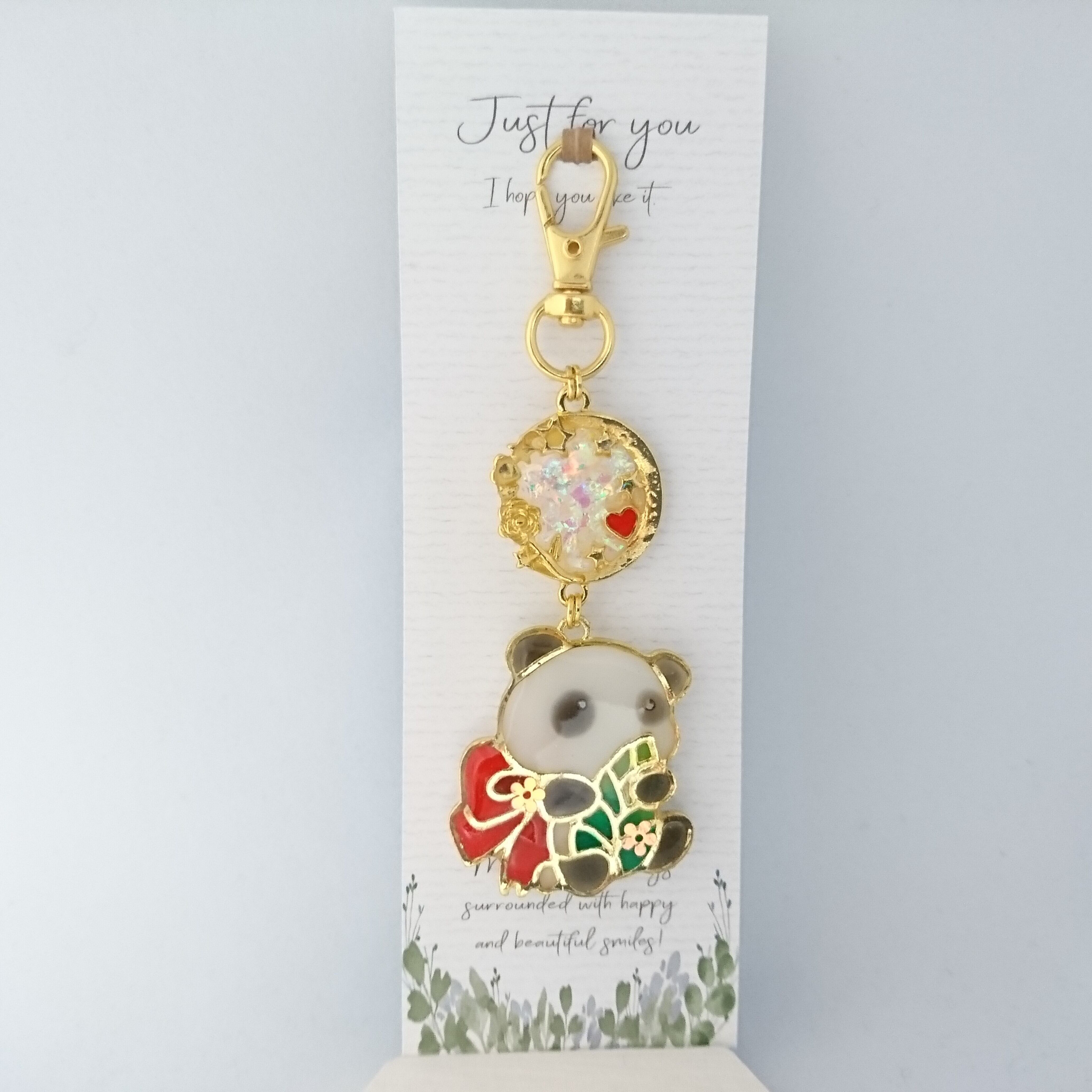 可愛いパンダちゃんに赤いリボンがポイントのキーホルダーです♪