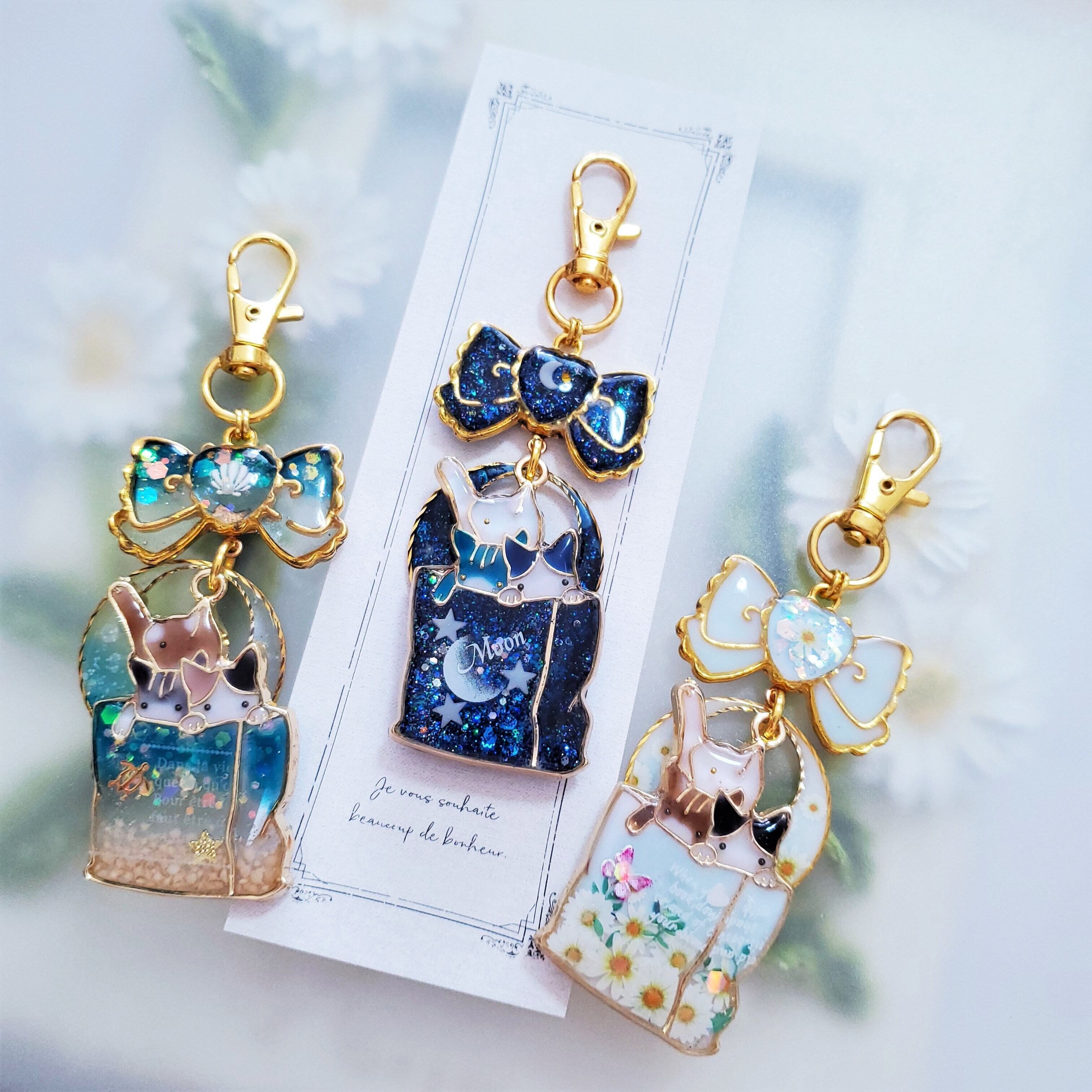 夜空模様の紙袋で遊ぶねこちゃんたちのキーホルダーです♪