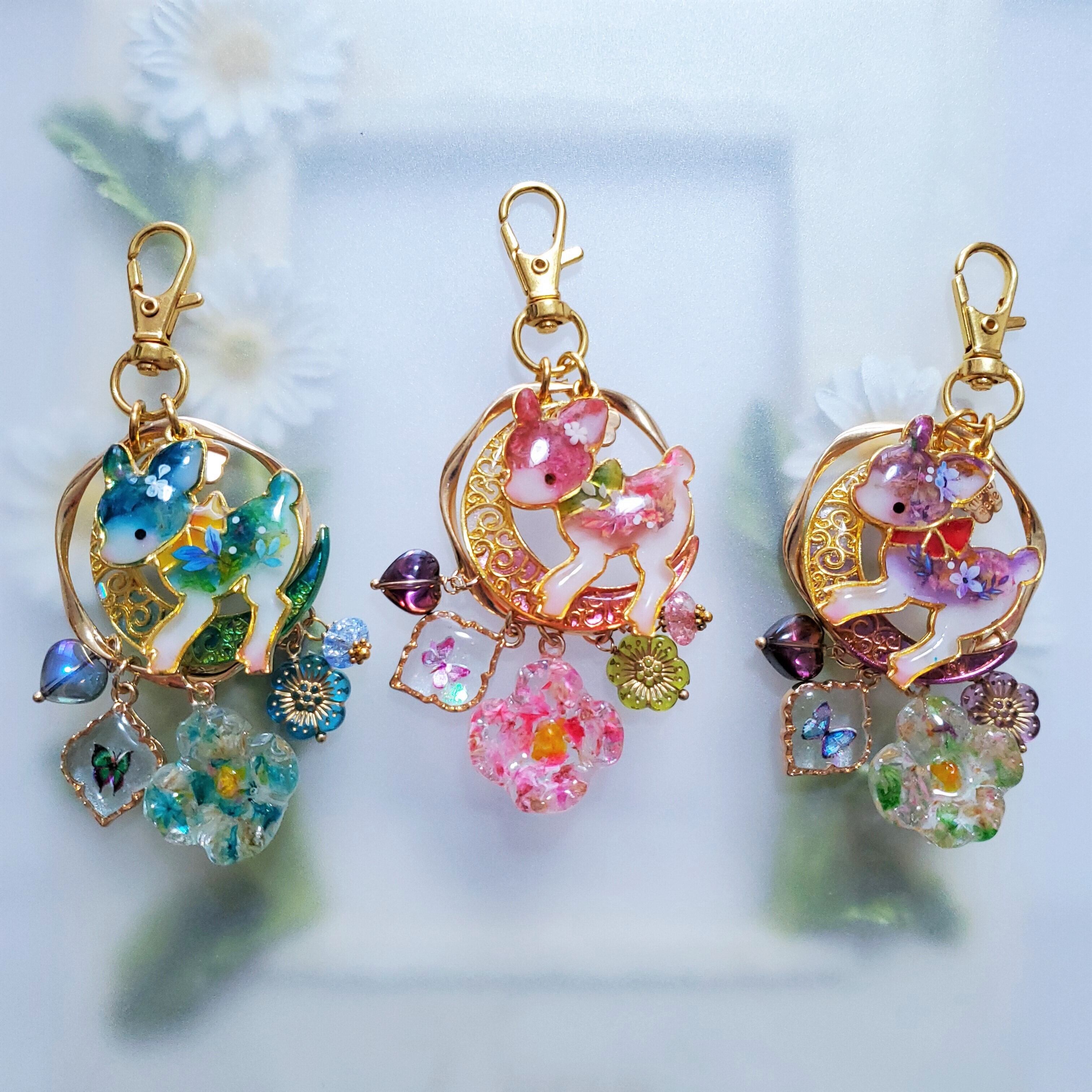 子鹿ちゃんやチャームにドライフラワーを飾った華やかなキーホルダーです。