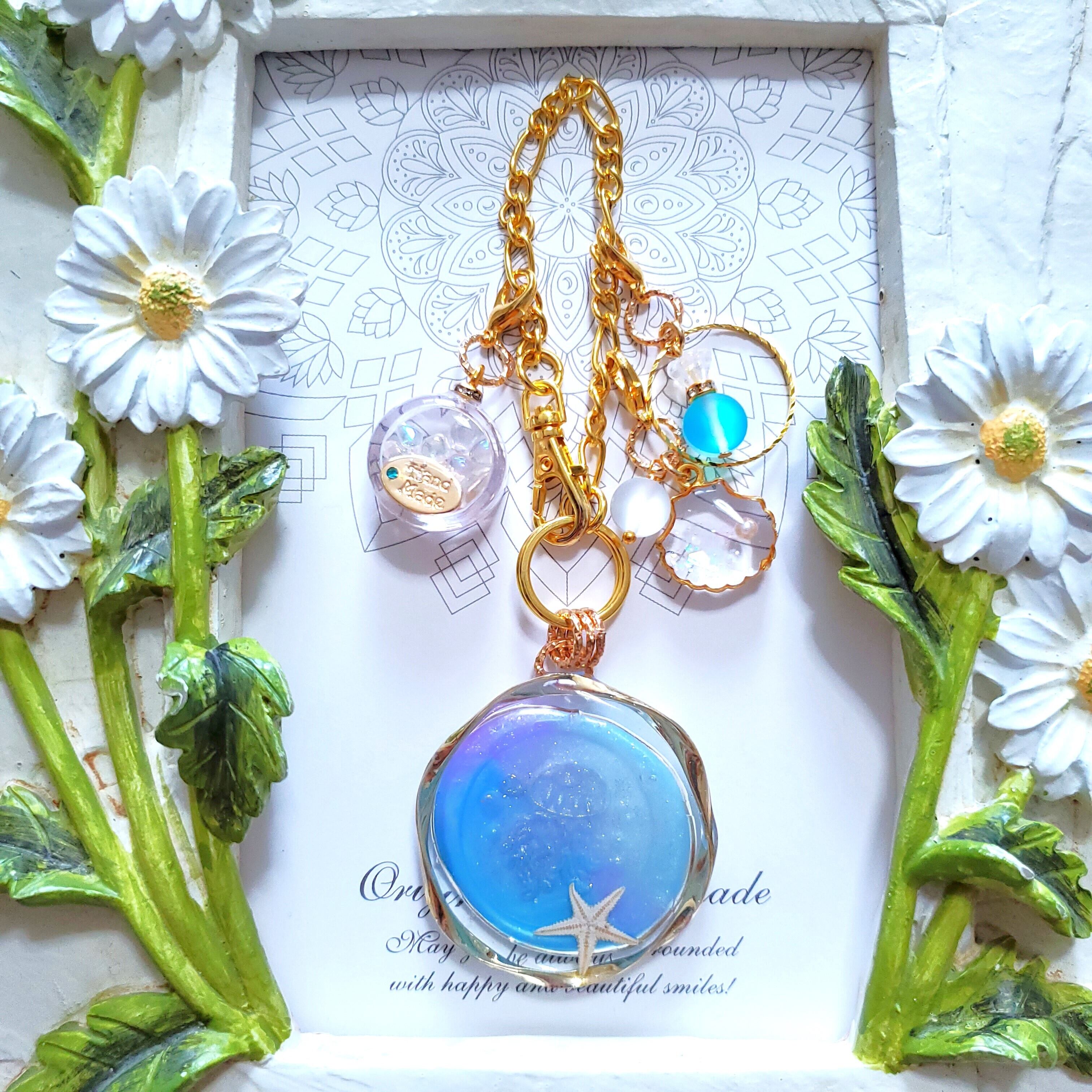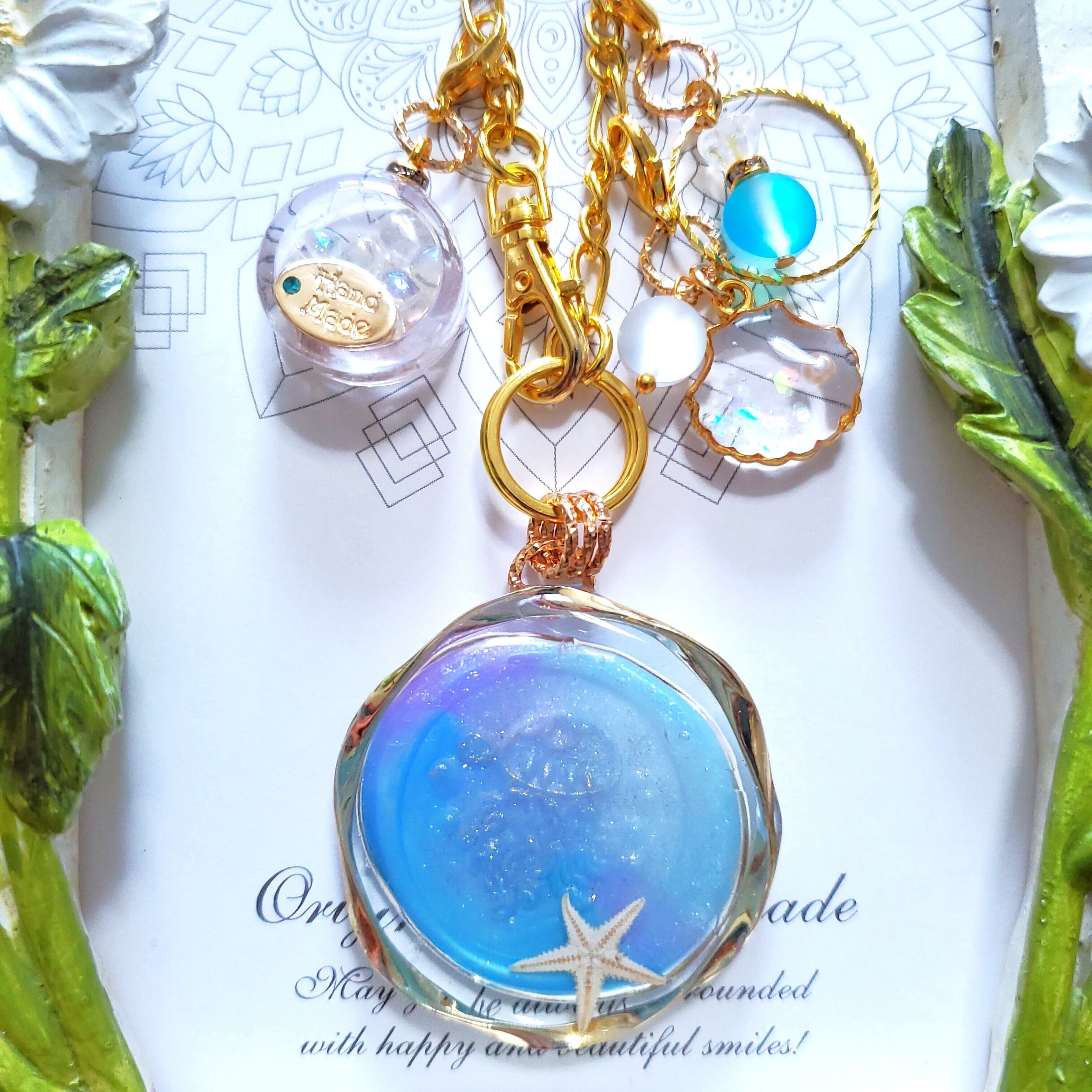 本物の小さなヒトデと一緒にバッグチャームに仕上げました。